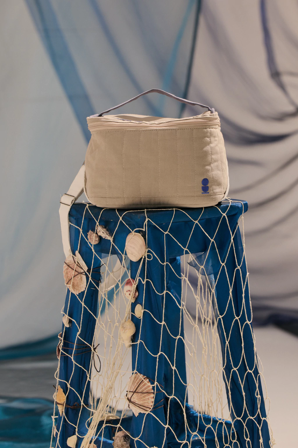 Mini bolso tipo conservadora con aislante térmico interno y forrería. Tamaño six pack con tiras y cierre.