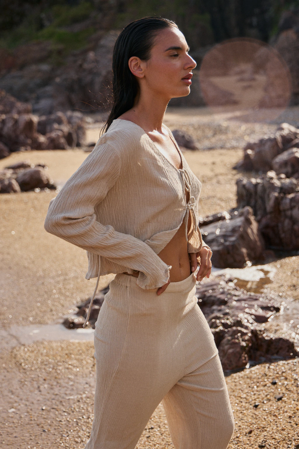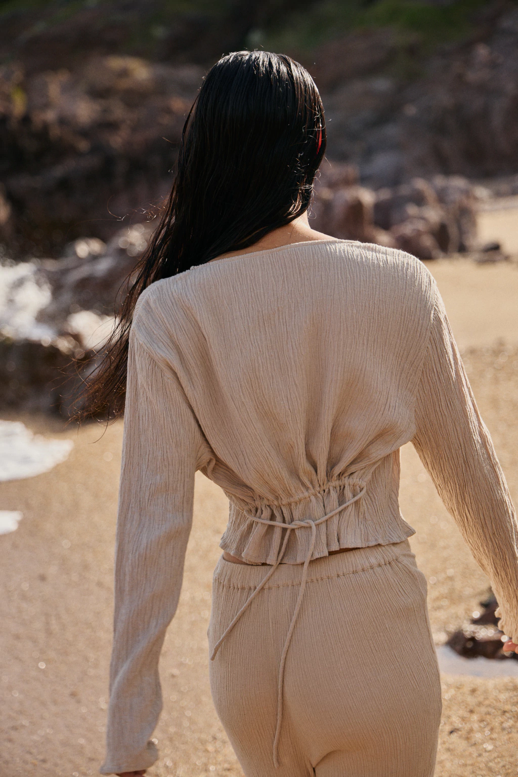 Camisa manga larga con tiras para anudar en el centro delantero. Tela de texturada arrugada.