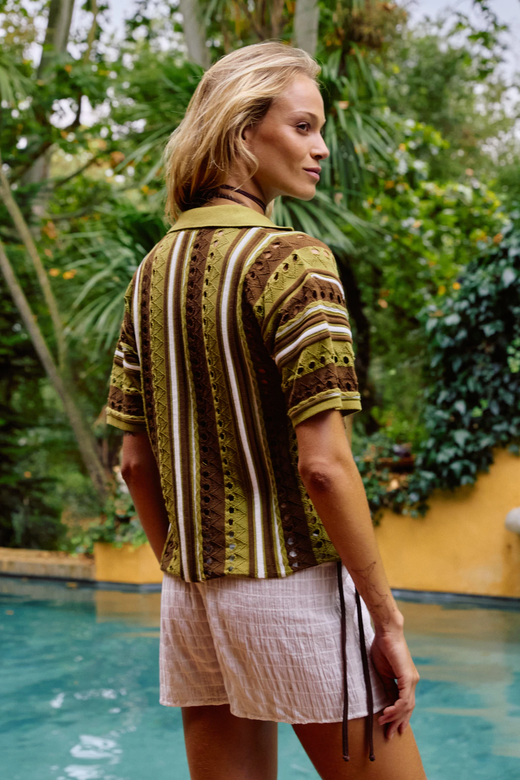 Camisa manga corta de un tejido rayado, con texturas y sustracciones, botones al tono y detalles en tejido liso.