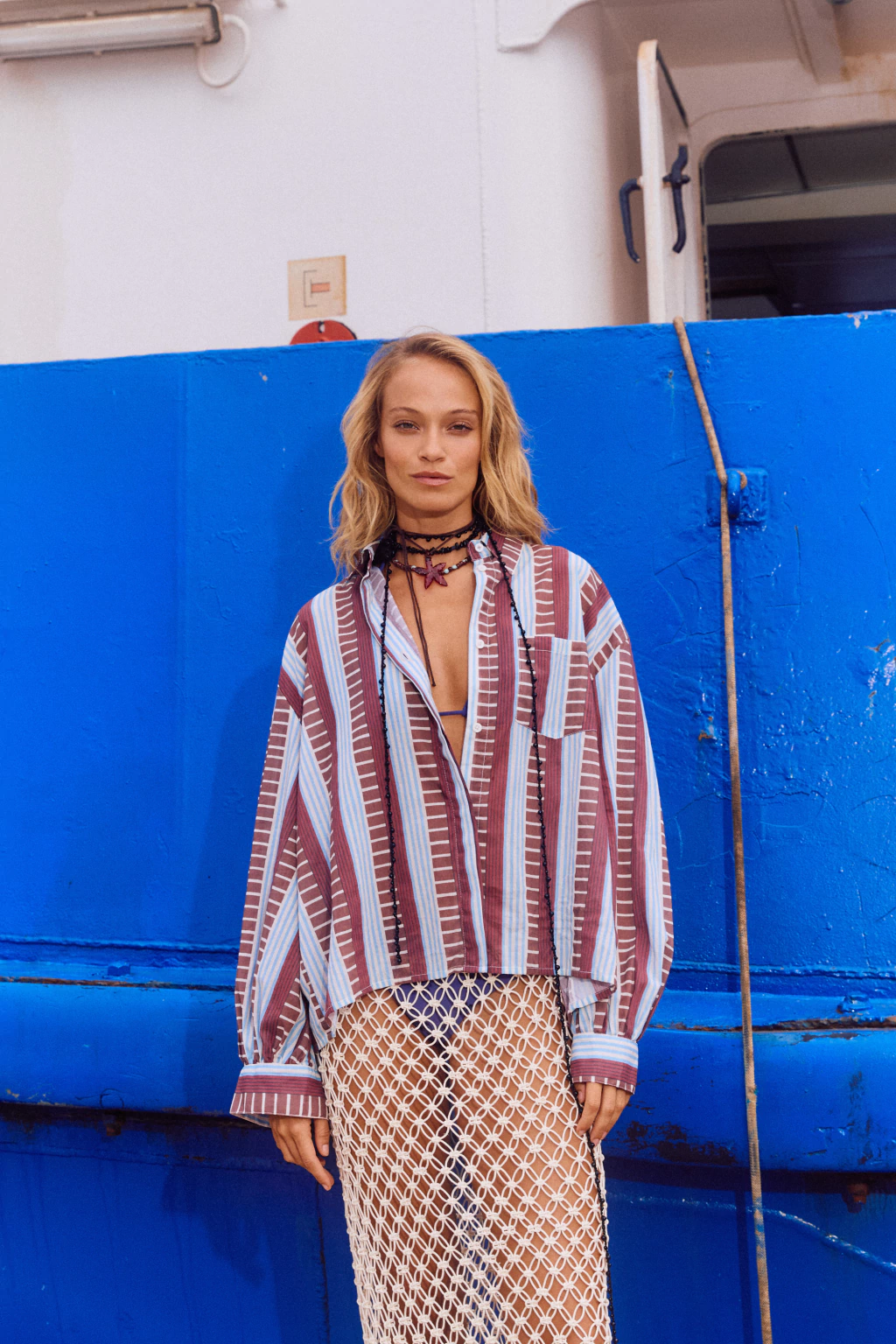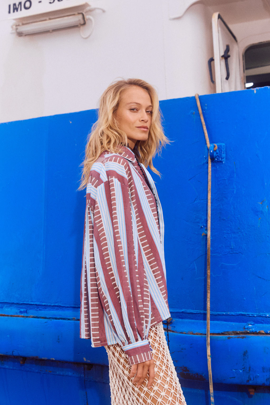 Camisa manga larga realizada en voile con estampa de rayas compuesta por varias estampas rayadas original de Odisea. Mangas super voluminosas, calce holgado y botones escondidos.