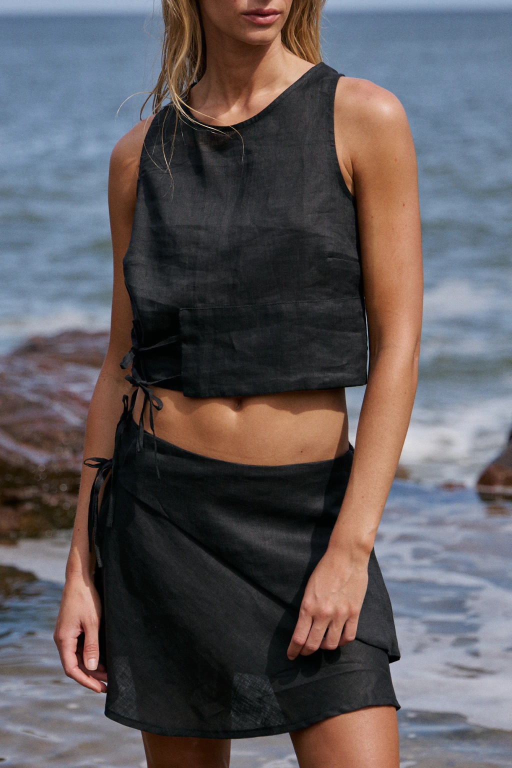 Pollera corta con sobrefalda en delantera y tiras para ajustar. Cierre lateral invisible al tono.