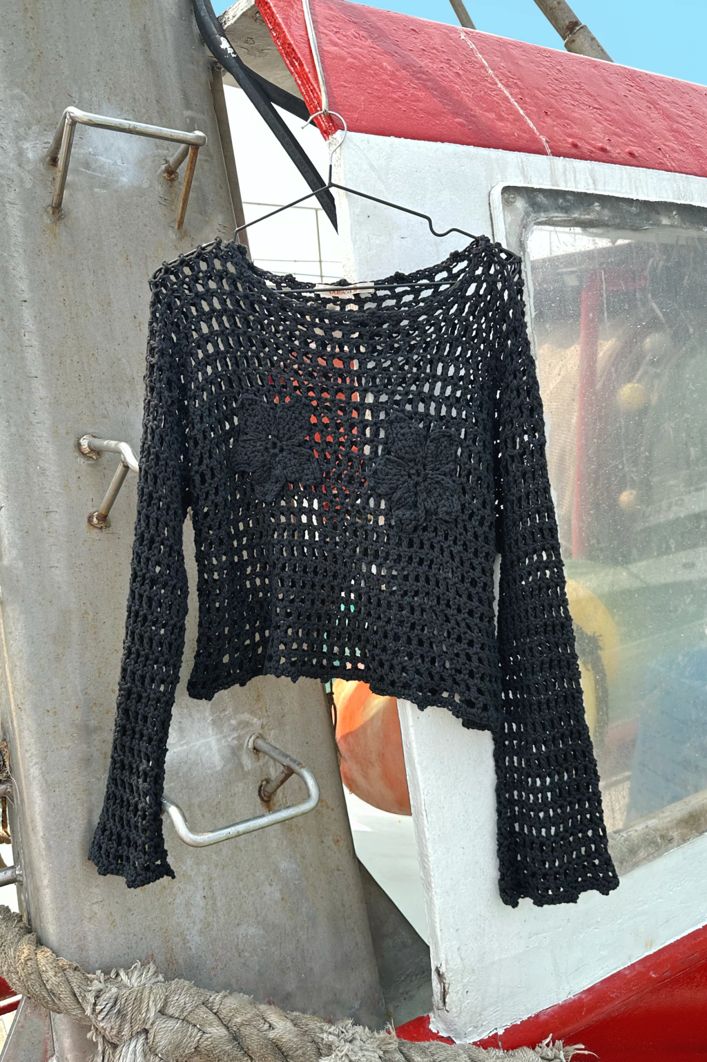 Sweater tejido a mano con punto de base calado mangas anchas en la altura de los puños y apliques de flores en el pecho.