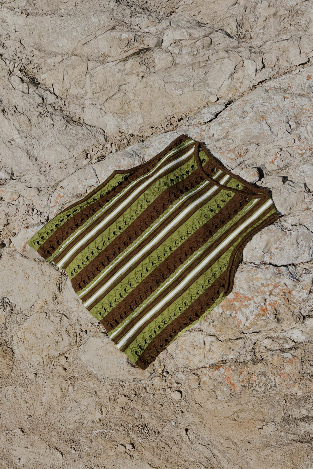 Top tejido rayado con punto compuesto, textura y sustracciones. Escote a la base con detalles y sisas de punto liso.
