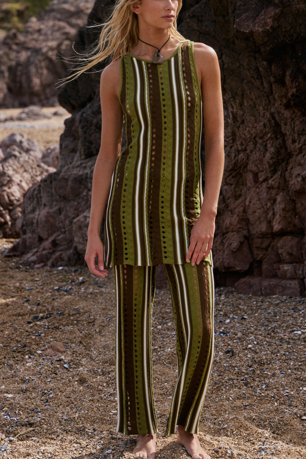 Vestido tejido rayado con punto compuesto con textura y sustracciones, escote a la base y sin mangas.